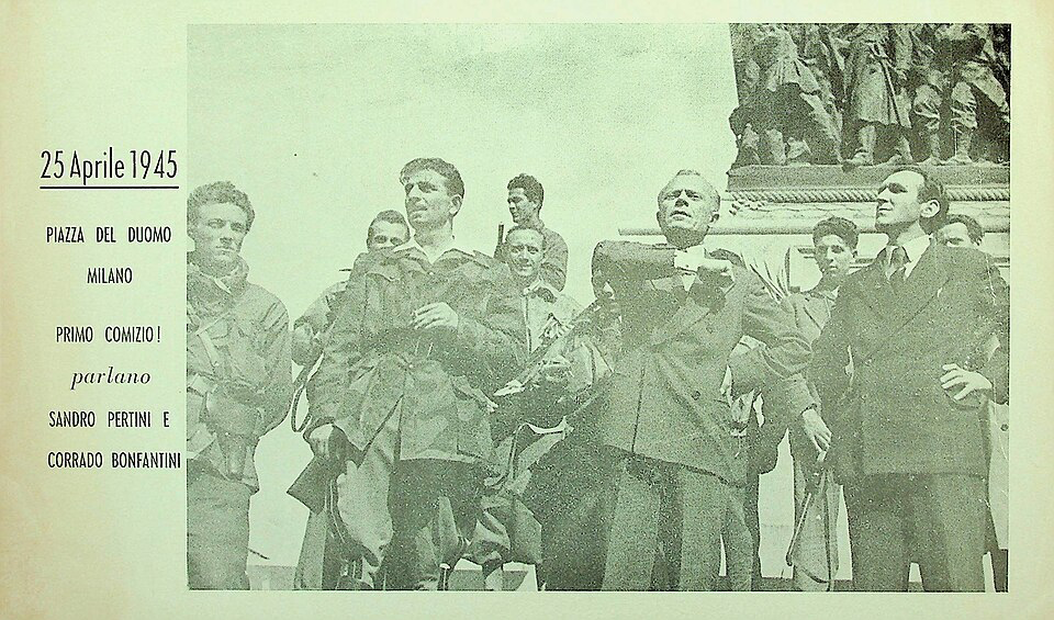 Sandro Pertini e Corrado Bonfantini che parlano al comizio del 25 aprile 1945 in Piazza Duomo di Fondazione Giangiacomo Feltrinelli, Pubblico dominio, da Wikimedia Commons