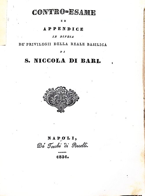 Image00238Contro Esame ed Appendice in difesa della Reale Basilica di San Niccola di Bari 01 di Centro Studi Baresi, Pubblico dominio, da Wikimedia Commons